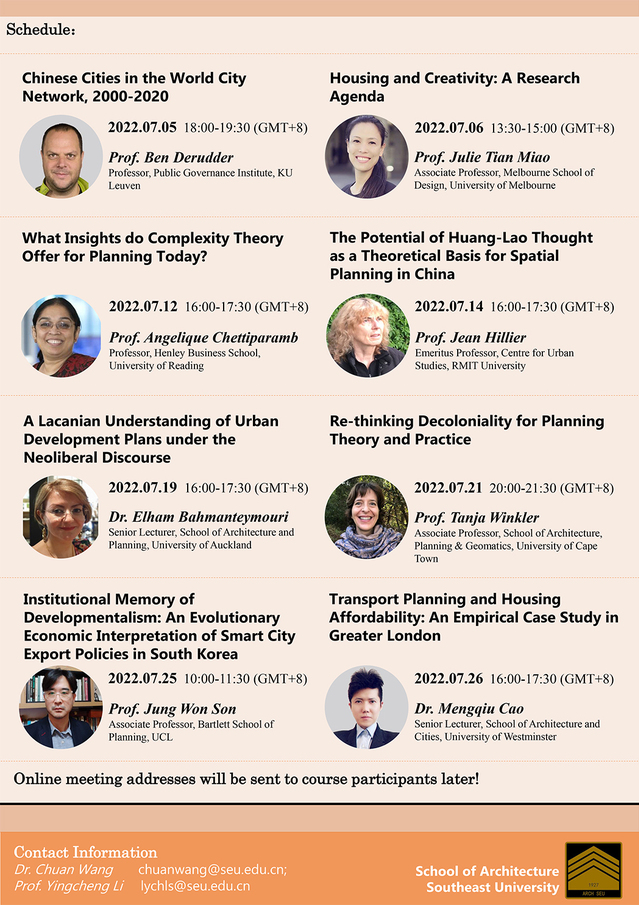 Overview Planning theories and methods are an important source of critical thinking in the planning discipline. This summer school course will invite 8 well-known international scholars to deliver various topics in the current frontier issues in planning research. It aims to help senior undergraduate and graduate students to keep up with the cutting-edge scholarship of international planning and improve their ability of critical thinking and writing.Online Lectures and Tutorials will be held between 5th July -26th July 2022. Students who are interested in the subject are welcome to register for free!
